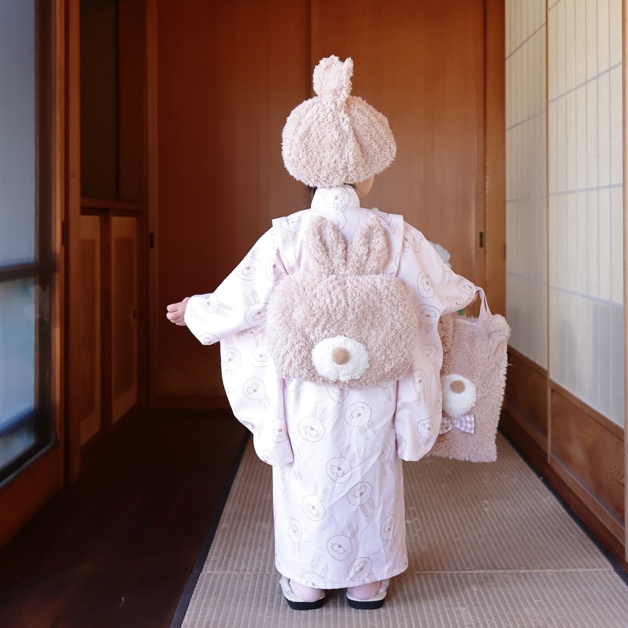 千歳飴袋をイメージした縦長のトートバッグはフロントにはうさぎの顔、うしろにはしっぽがついて360℃どこから見ても可愛く魅せてくれます。